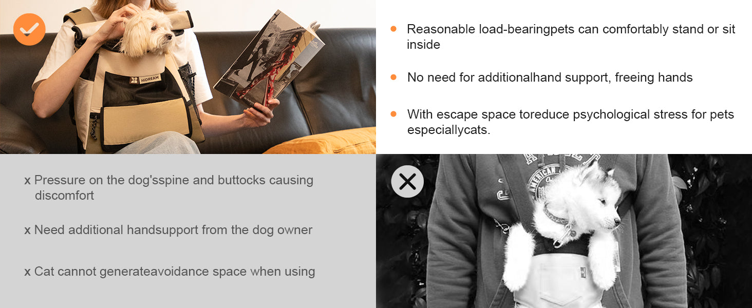 - ERGONOMIC DESIGN The bottom of the dog front carrier is a hard base that does not damage the dog's spine, making it convenient for the dog to sit and stand in the bag when traveling. The backpack design conforms to ergonomics and can withstand 12 pounds without tilting. Use breathable mesh on the top and sides of the bag, making the dog carrier backpack more breathable and less prone to stuffiness