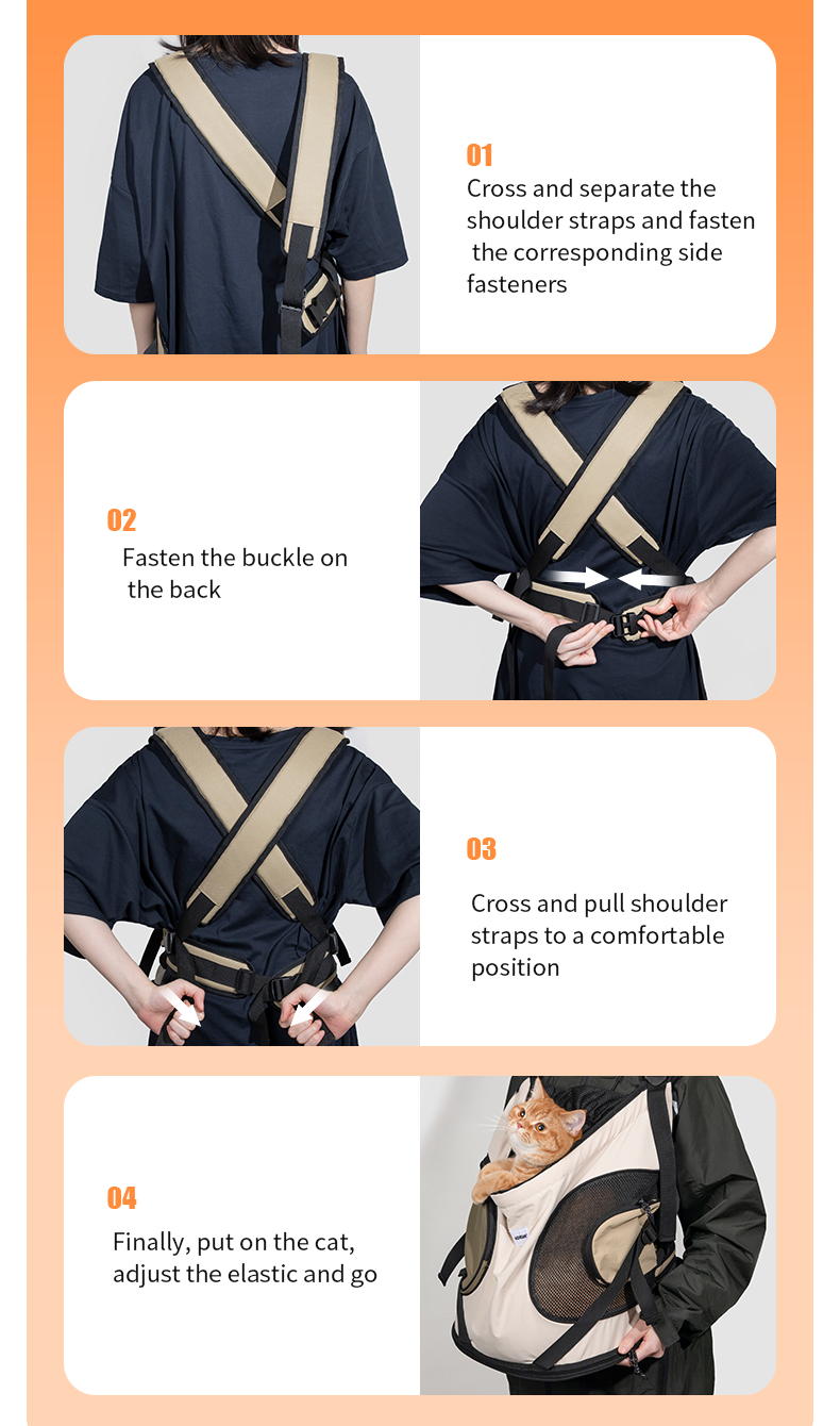1.Cross and separate theshoulder straps and fastenthe corresponding side fasteners