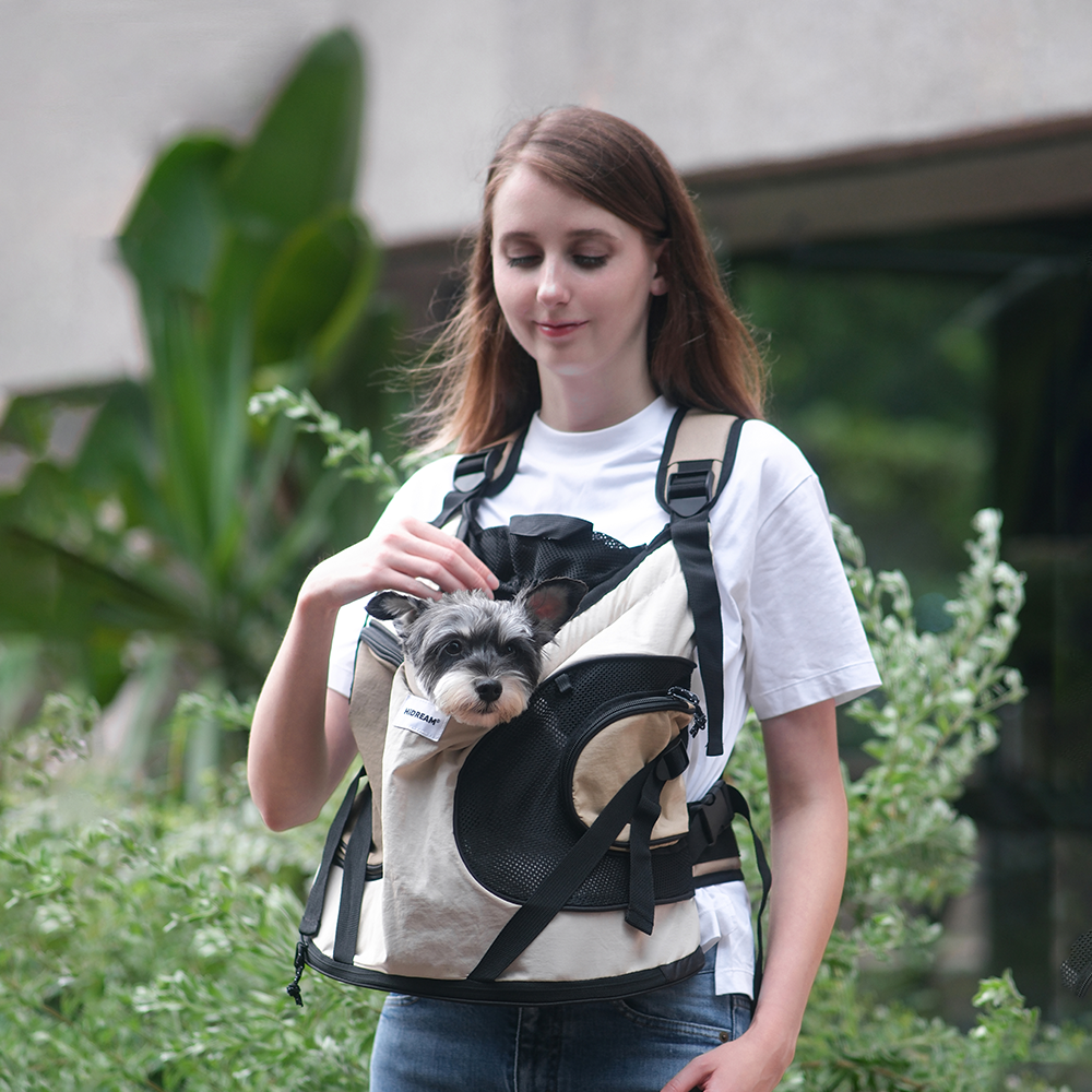 - SAFE PUPPY CARRIRES TO WEAR FOR SAMLL DOGS Small dog backpack carrier equipped with an anti escape buckle inside the front carrier that can connect to the dog's collar which will prevent pet get out and protect the safe of pet.Adjustable opening at the top of the drawstring mesh for more security for the dog. Dog front carrier is suitable for indoor and outdoor environments such as long-distance travel, cycling, and subway.