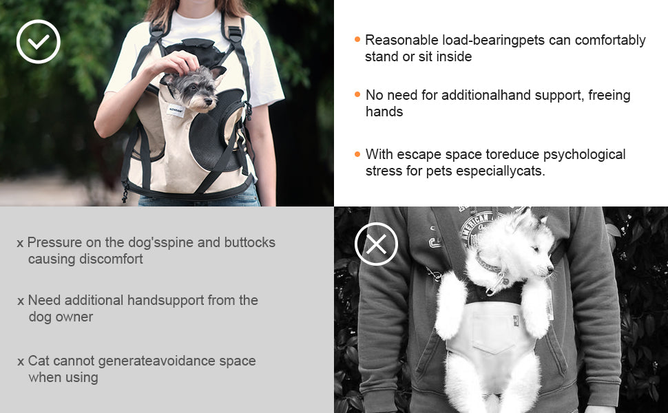 - ERGONOMIC DESIGN The bottom of the dog front carrier is a hard base that does not damage the dog's spine, making it convenient for the dog to sit and stand in the bag when traveling. The backpack design conforms to ergonomics and can withstand 20 pounds without tilting. Use breathable mesh on the top and sides of the bag, making the dog carrier backpack more breathable and less prone to stuffiness